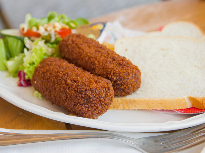 Special place in Dutch food culture is taken by kroketten and bitterballen. They are bar snacks, street food, cures to hangover, and comfort food wrapped into one. They both begin alike: with a bulky ragout of beef or veal (and in some cases mushroom or shrimp), held together with roux, cooled, and moulded, and then breaded and deep-frying to the point where the outer surface cracks, and the interior turns molten. A kroket is sausage-shaped of approximately the thickness of a sausage, which is commonly consumed upon soft white buns with mustard as broodje kroket.